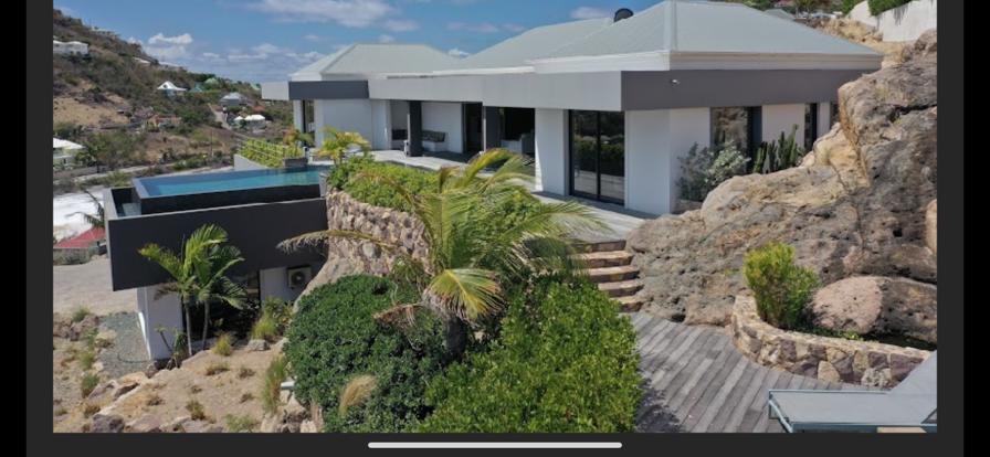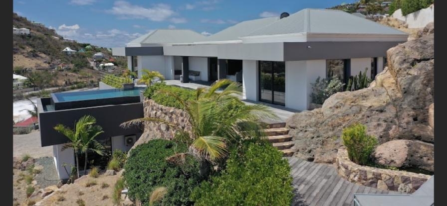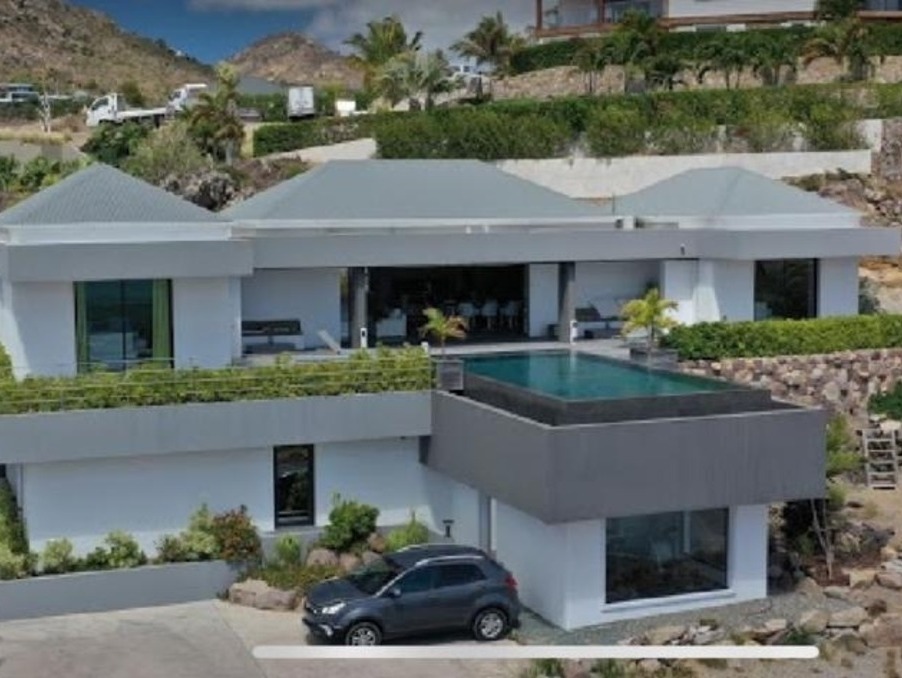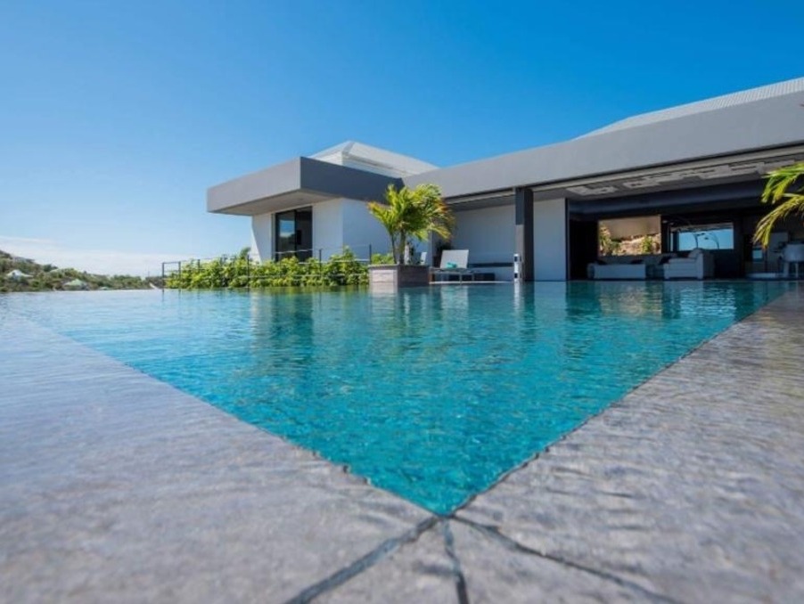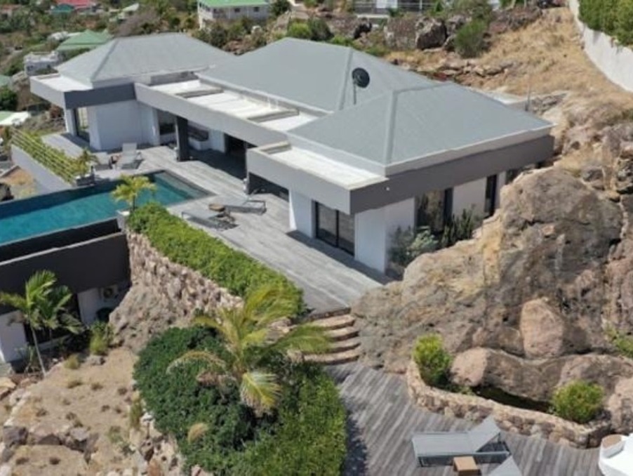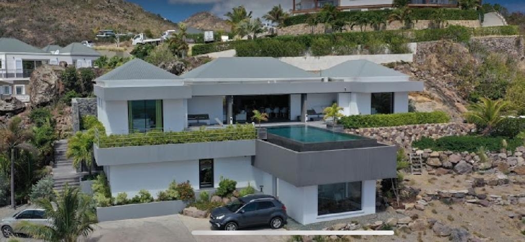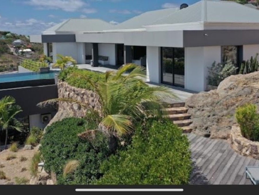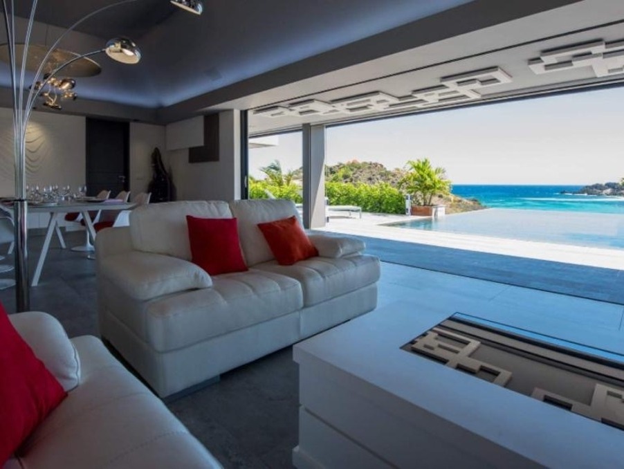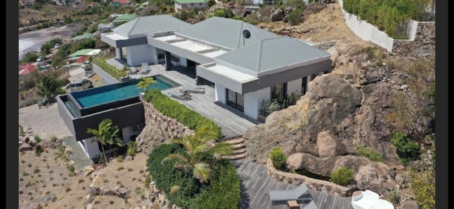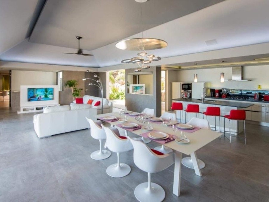 Cette villa récente s'élève sur deux niveaux, les pièces de vie principales se composent d'un salon très spacieux, d'une salle à manger intérieure avec une cuisine ouverte particulièrement complète et bien équipée. L'ensemble s'ouvre sur une grande terrasse avec piscine chauffée à débordement qui surplombe le lagon de Petit-Cul-de-Sac .