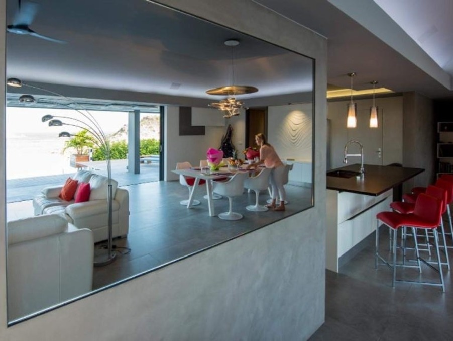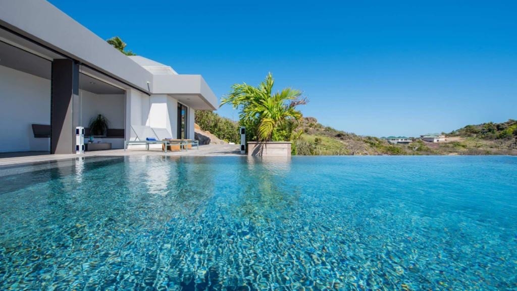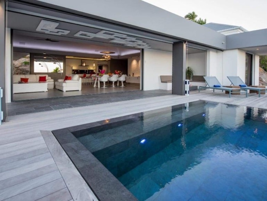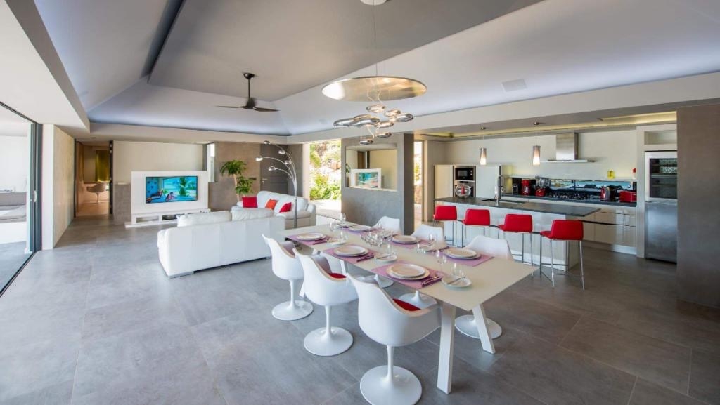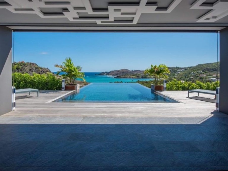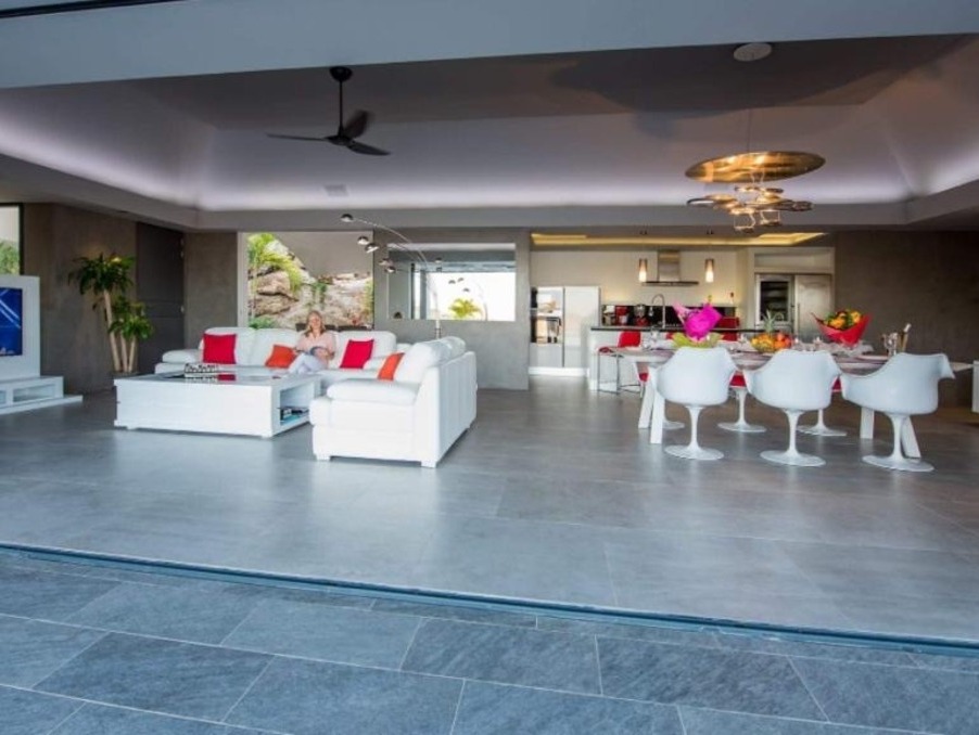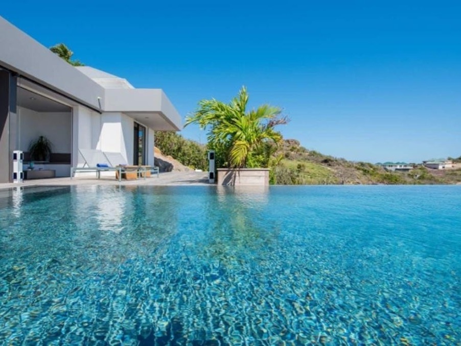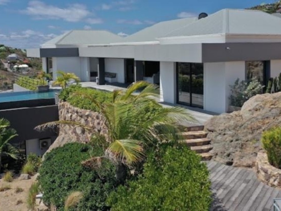 Cette villa récente s'élève sur deux niveaux, les pièces de vie principales se composent d'un salon très spacieux, d'une salle à manger intérieure avec une cuisine ouverte particulièrement complète et bien équipée. L'ensemble s'ouvre sur une grande terrasse avec piscine chauffée à débordement qui surplombe le lagon de Petit-Cul-de-Sac .