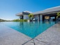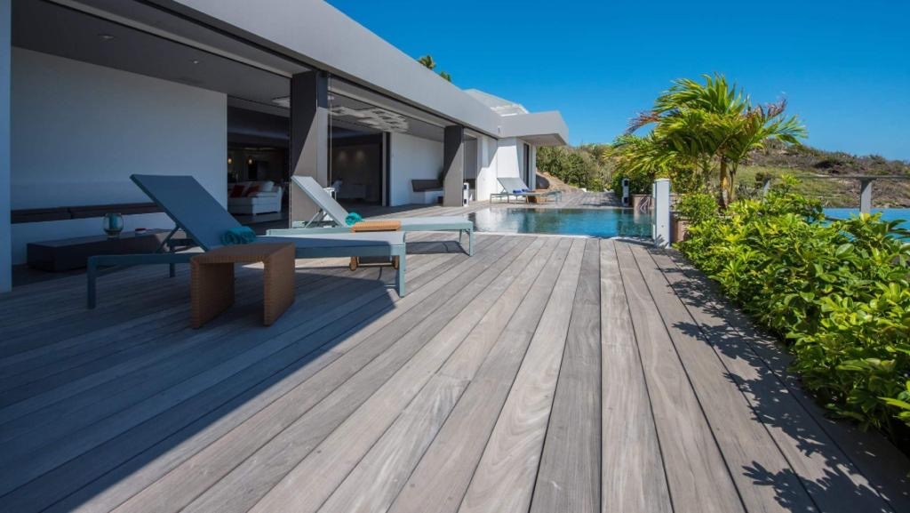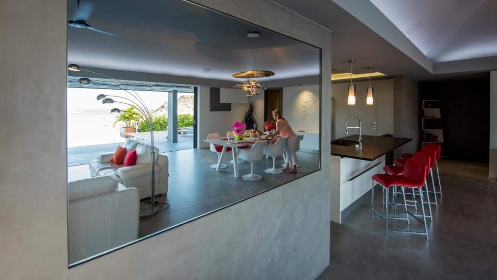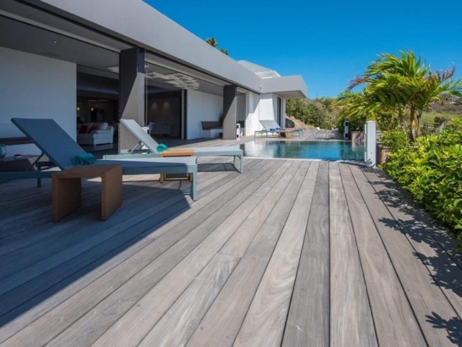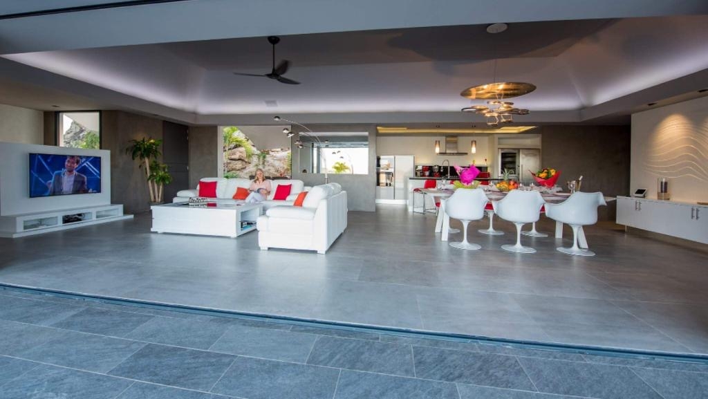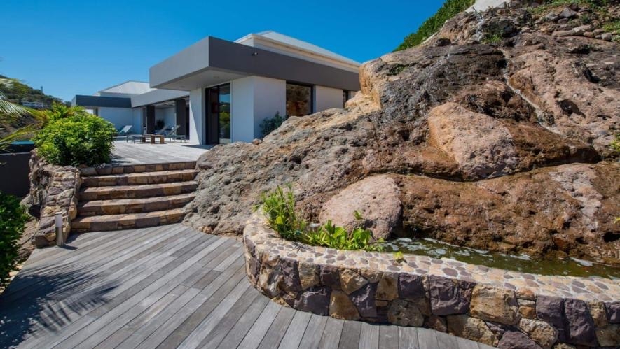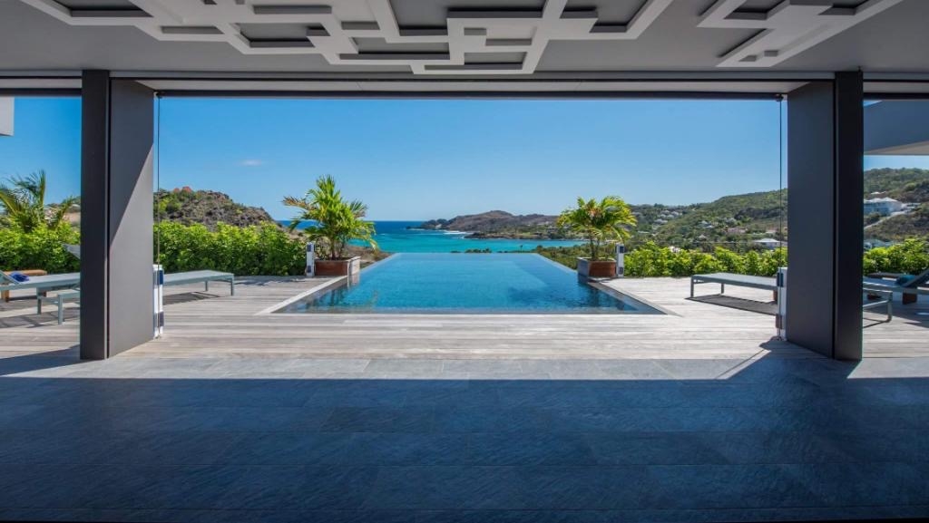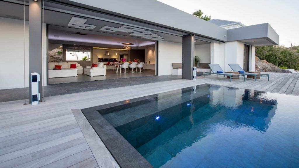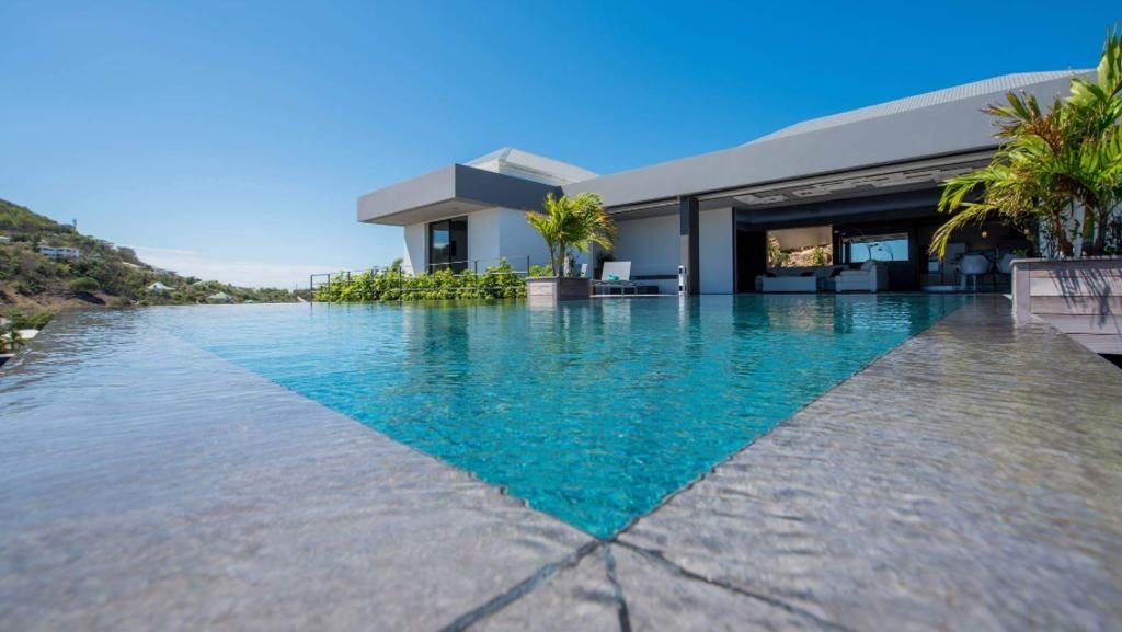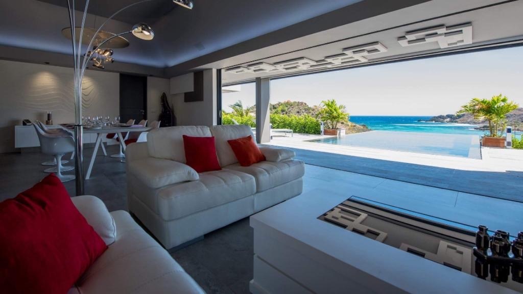 Cette villa récente s'élève sur deux niveaux, les pièces de vie principales se composent d'un salon très spacieux, d'une salle à manger intérieure avec une cuisine ouverte particulièrement complète et bien équipée. L'ensemble s'ouvre sur une grande terrasse avec piscine chauffée à débordement qui surplombe le lagon de Petit-Cul-de-Sac .